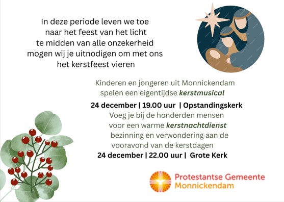 De jaarlijkse Lichtjestocht vindt plaats op vrijdag 19 december. De route is uitgestippeld, de spelers zijn benaderd en de promotie is gestart. We zien uit naar een gezellig event waarbij het kerstverhaal tot leven komt voor jong en oud. De tocht start tussen 16:45 - 18:00 uur, begin- en eindpunt zijn bij de Grote Kerk van Monnickendam.