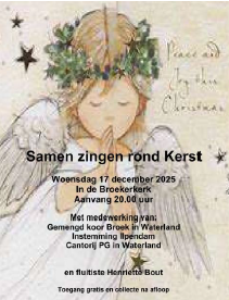 We zetten de traditie nog steeds voort. Drie koren uit Gemeente Waterland laten hun eigen kerstkeuze horen en natuurlijk zingen ze samen met u de vertrouwde kerstliederen. Met medewerking van: Gemengd koor Broek in Waterland, Cantorij PG in Waterland en Instemming uit Ilpendam en als solist Henriette Bout, fluitist. We nodigen iedereen uit om ook mee te doen: samen zingen en luisteren naar ‘kerst ’muziek. Na afloop, zo ongeveer rond 21.15 uur, is er gelegenheid elkaar te ontmoeten met koffie, thee, frisdrank of wijn.