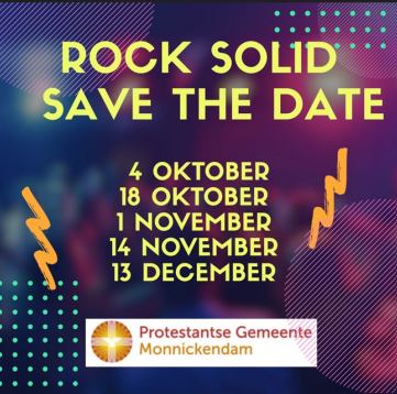 We starten weer met Rock Solid op zaterdag 4 oktober in het jeugdlokaal van de Opstandingskerk. De avond duurt van 19:30 tot 21:30.